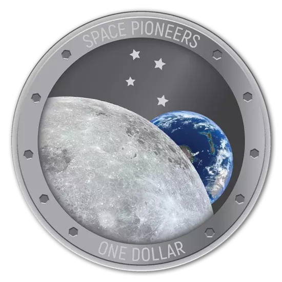 Limitowana moneta Pionierzy Kosmosu 1 uncja kolorowana Srebra 2019 Proof to egzemplarz, który upamiętnia 50. rocznicę lądowania na Księżycu. Moneta przedstawia widok Ziemi zza Księżyca oraz gwiazdozbiór Krzyża Południa. Widoczna jest także Nowa Zelandia.
