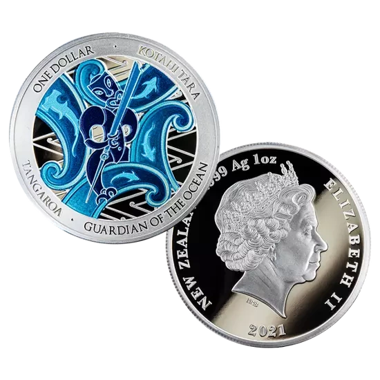 Tangaroa Strażnik Oceanu: Zestaw 2 monet kolorowanych 2 uncje Srebra 2021 to zestaw, który przedstawia Tangaroa, który w mitologii Maorysów był strażnikiem wszystkich oceanów, wód oraz stworzeń morskich. Jest to pierwszy zestaw poświęcony mitologicznym, maoryskim postaciom. Monety posiadają nominał o wartości $1. Zestaw posiada limitowany nakład, liczący jedyne 400 sztuk. Zestaw ten będzie znakomitym uzupełnieniem każdej kolekcji.
