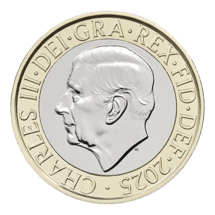 - Die £2-Brillant-Uncirculated-Münze aus einer Kupfernickel-Legierung und vernickeltem Stahl, Gewicht 12 g, Durchmesser 28,4 mm.