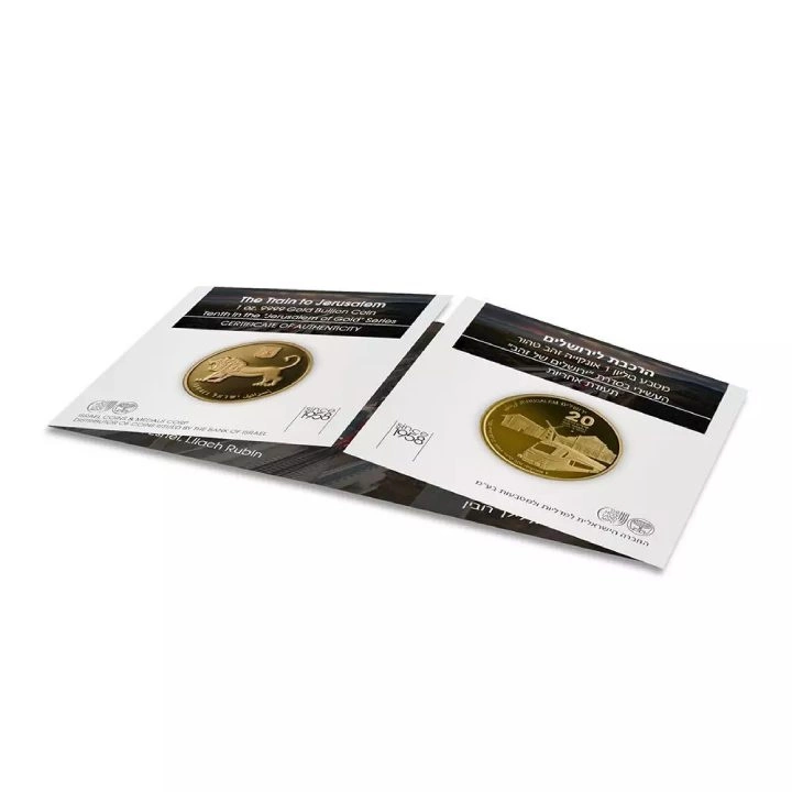 Die Vorderseite zeigt den berühmten Zug, der nach Jerusalem fährt, entworfen von Lilach Rubin. Die Vorderseite enthält Informationen über den Nennwert, das Jahr, das Gewicht und den Reinheitsgrad des Goldes. Darüber hinaus trägt die Münze das Münzzeichen - den Davidstern.