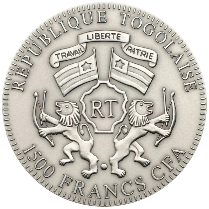 Diese Münze besteht aus .999 Feinsilber, wiegt 2 Unzen und hat einen Durchmesser von 50 mm. Die „Antikfinish“-Technik verleiht der Münze ein besonderes, gealtertes Aussehen. Die Auflage ist auf 999 Exemplare begrenzt. Die Münze ist ein gesetzliches Zahlungsmittel in der Republik Togo.