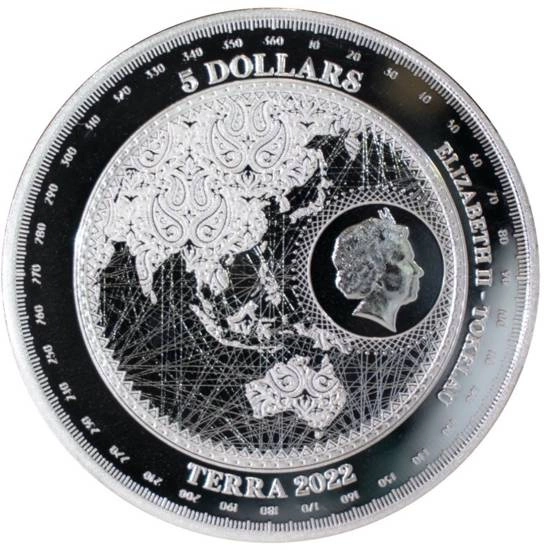 Srebrna moneta Tokelau: Terra 1 uncja Srebra 2022 Prooflike to ciekawa, inwestycyjna propozycja przygotowana przez Słowackiego producenta metali szlachetnych - Pressburg Mint. Produkt "Terra" została wykonana z czystego srebra próby Ag.9999, o wadze 1 uncji trojańskiej oraz średnicy liczącej 38 mm, w standardzie prooflike. Walor prezentuje Terrę, co oznacza w języku łacińskim - kulę ziemską.