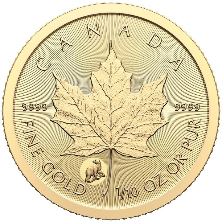 Canadian Maple Leaf Treasured 1/10 ounce Gold 2024 Polar Bear Privy Mark (First Strikes), ist die erste Prägung mit dem neuen Bild des kanadischen Monarchen Seine Majestät Karl III. und eine der bekanntesten Anlagemünzen der Welt. Sie wird seit 1979 ununterbrochen von der Royal Canadian Mint hergestellt - einer renommierten und bei Anlegern bekannten kanadischen Münzprägeanstalt, die Investitionen in Edelmetalle über ein Produkt anbietet, das später leicht mit Gewinn weiterverkauft werden kann. Die Währung zeichnet sich durch ihre hohe Liquidität im Falle eines Kauf-/Verkaufswunsches und durch ihr besonders bewundertes Bild auf der Rückseite aus.