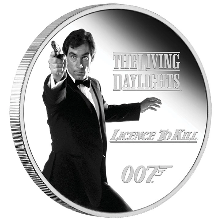Auf den Rückseiten der Silbermünze ist Timothy Dalton als Agent 007 abgebildet, die Rückseite wurde von Lucas Bowers gestaltet.