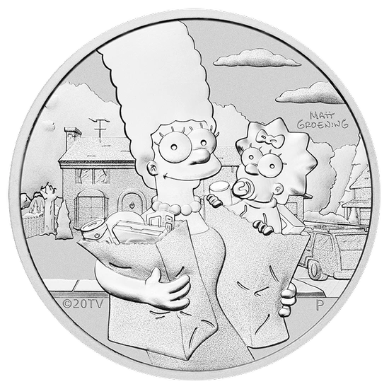 Rewers srebrnej monety przedstawia Marge and Maggie przed rodzinnym domem Simpsonów. Projektantem rewersu był Matt Groening.