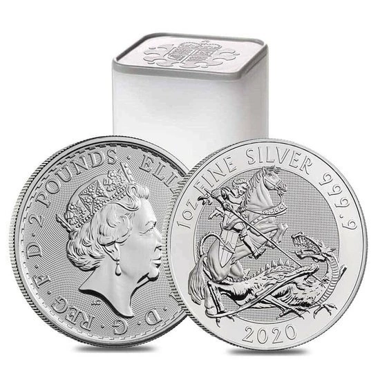 Srebrny walor z wizerunkiem Św. Jerzego i Smoka przedstawia kulminacyjny moment walki pochodzący ze znanej angielskiej legendy. Ten bulionowy okaz perfekcji został wyprodukowany w 2020 roku, o wadzę 1 uncji oraz próbie srebra 9999.