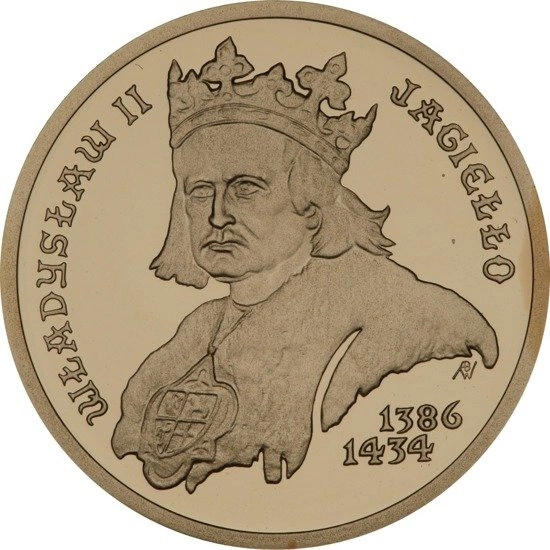Złota moneta kolekcjonerska honorująca króla Władysława II Jagiełłę pochodzi z Narodowego Banku Polskiego. Złoty walor posiada masę wynoszącą 8 gramów oraz próbę złota 900. Jej niezwykłość podkreśla lustrzane wykończenie oraz limitowany nakład, który wyniósł 2 200 sztuk. Moneta znajduje się w etui (brak certyfikatu).