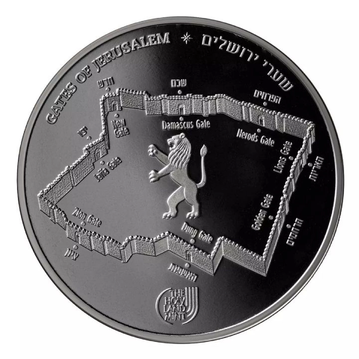 Die Rückseite zeigt eine stilisierte Skizze des Tors der Altstadt innerhalb der Stadtmauern Jerusalems, die Aufschrift "GATES OF JERUSALEM" und das Logo der "The Holy Land Mint". Die Rückseite wurde von Zvika Roitman entworfen.