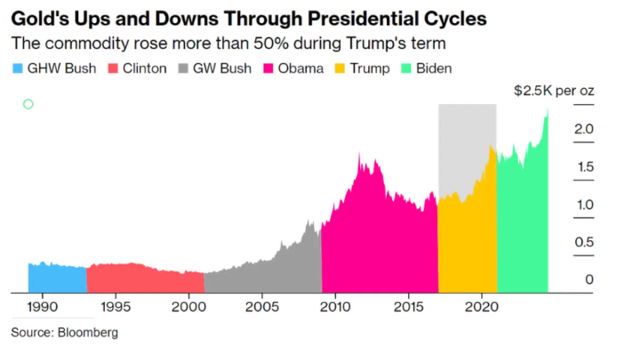 During ongoing Joe Biden’s Presidency, gold mostly experienced sideways moves, which finally turned into move up initiated at the end of 2023. This was approximately 30% move, attributed to general macro environment, and escalated demand shown by central banks.