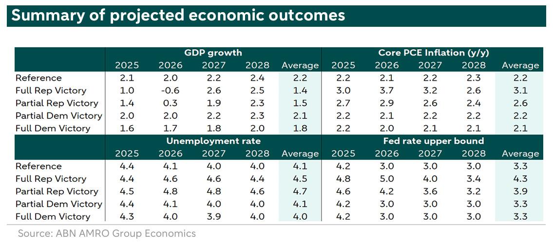 ABN AMRO projected outcomes on GDP growth, CPI, unemployment and FED rates, depending on the elections outcome. Source: Abnamro
