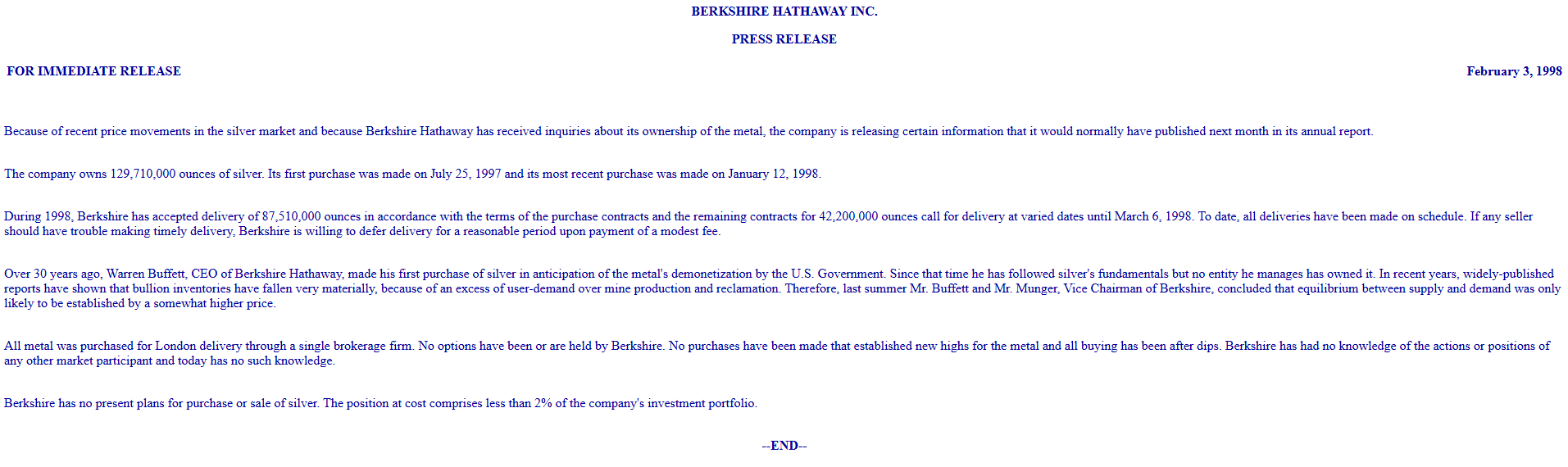 Silver purchases by Berkshire Hathaway occurred in a period commencing 25th July 1997 and ended on 12th in January 1998. How do we know that? Following 1997 annual letter to investors, dated on 27th February 1998 - Warren Buffet himself mentioned 111.2 mln ounces acquired in 1997. We’ll refer to this source later in the text. Remaining 18.5 mln ounces had been purchased on 12th in January 1998. Which finds further confirmation in Berkshire Hathaway’s press release dated 3rd February 1998.