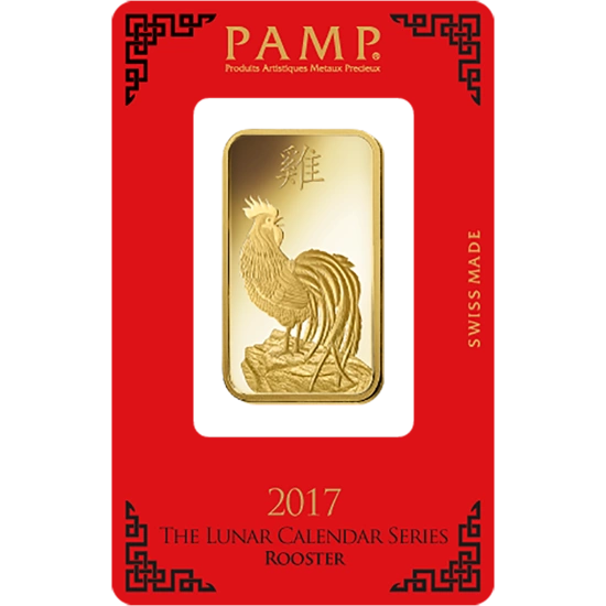 Silver Bar 1 Ounce Lunar Series Year of the Rooster "Gold is the most malleable of all metals; one gram of gold can be broken into a sheet of 1 m². A flake of gold can be broken down to the point where it becomes translucent. Common alloys of coloured gold, such as rose gold, can be made by adding varying amounts of copper and silver. Alloys containing palladium and nickel form so-called 'white gold', which is often used in jewellery. Less common are gold alloys containing additions of manganese, aluminium, iron, iridium and other elements that give gold more unusual colours, such as blue. Gold is a precious metal with an extremely high chemical resistance, much higher than copper and silver. Unlike them, it does not darken in air. It is also resistant to most corrosive agents, making it ideal for coinage, jewellery and protective plating of more reactive metals.'' Bars are one of the many investment options available, and are also one of the oldest ways of investing capital. In Arab countries, India and Singapore, bars are popular with the weight expressed in the traditional unit of 1 tola, standardised as 5/8 troy ounce. In Arab countries, bars with a weight of 1 dinar, standardised as 1/7th of a troy ounce, are also found.All the bars we sell are certified by the LBMA. ''The LBMA sets and oversees compliance with the quality and safety requirements of the London Bullion Market. Mints that meet these are placed on the regularly updated Good Delivery List. Purchasing a bar produced by such a mint ensures that it can be resold anywhere in the world where investment bars are traded. On the other hand, the price received will be the highest possible, i.e. it will be higher than the price of bars produced by mints that have not received LBMA accreditation."