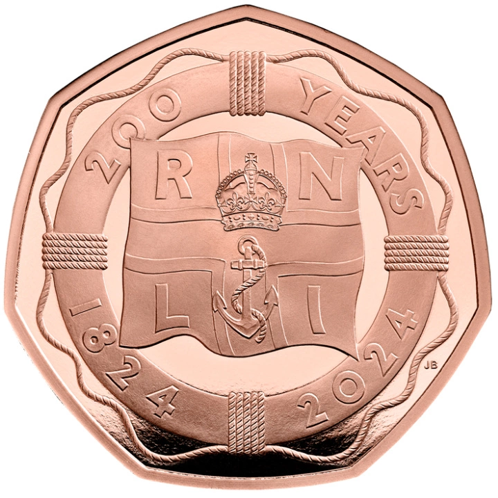 Rewers of the coin depict the RNLI flag surrounded by a lifebelt and the inscription "200 YEARS", "1824-2024"