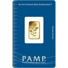 Gold Flake 5 grams Pamp Rose "Gold is the most malleable of all metals; one gram of gold can be broken into a sheet of 1 m². A flake of gold can be broken down to the point where it becomes translucent. Common alloys of coloured gold, such as rose gold, can be made by adding varying amounts of copper and silver. Alloys containing palladium and nickel form so-called 'white gold', which is often used in jewellery. Less common are gold alloys containing additions of manganese, aluminium, iron, iridium and other elements that give gold more unusual colours, such as blue. Gold is a precious metal with an extremely high chemical resistance, much higher than copper and silver. Unlike them, it does not darken in air. It is also resistant to most corrosive agents, making it ideal for coins, jewellery and protective plating of more reactive metals." Bars are one of the many investment options available, and are also one of the oldest ways to invest capital. In Arab countries, India and Singapore, bars are popular with weights expressed in the traditional unit of 1 tola, standardised as 5/8 troy ounce. In Arab countries, it is also common to find bars with a weight of 1 dinar, standardised as 1/7th of a troy ounce. All the bars we sell are LBMA certified. "The LBMA sets and oversees compliance with the quality and safety requirements of the London Bullion Market. Mints that meet these are placed on the regularly updated Good Delivery List. Purchasing a bar produced by such a mint ensures that it can be resold anywhere in the world where investment bars are traded. On the other hand, the price received will be the highest possible, i.e. it will be higher than the price of bars produced by mints not accredited by the LBMA."