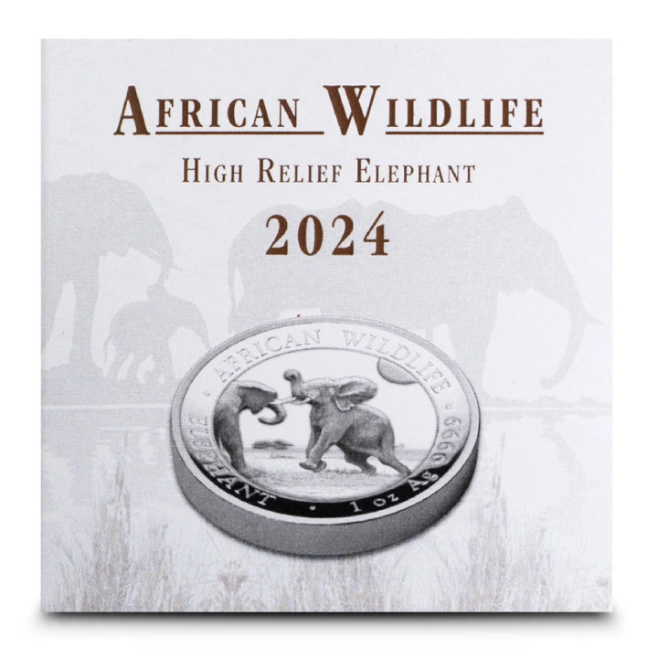 The silver Somali Elephant coin is the next instalment of a series created in 1999 called the Somali Elephant. Interestingly, the first pieces in the 1999 series were minted as coins guaranteed by the Zambian government. The copies minted after 2003 have a different guarantor, which is the Somali government. In addition, a series of silver and gold Somali Elephant coins are part of the African Wildlife collector programme.The 2024 silver piece was produced by the German precious metals producer Bayerisches Hauptmünzamt, with a weight of one troy ounce and a bullion purity of Ag.9999 and a diameter of 38.60 mm. What is more, African Wildlife: Somali Elephant coins that were produced after 2004 act as legal tender and are guaranteed by the Somali government as to the legality, purity of the bullion and origin of the metal. The Averse depicts the Somali coat of arms, two leopards supporting a shield with a star, along with information on the year of mintage and the denomination of the coin.