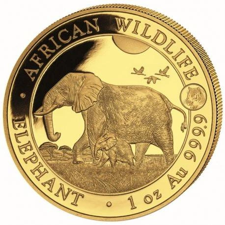 Złota moneta Słoń Somalijski to kolejna już odsłona powstałej w 1999 roku serii noszącą nazwę Słoń Somalijski. Co ciekawe, pierwsze egzemplarze z serii z roku 1999 były bite jako monety posiadające gwarancję rządu Zambii. Egzemplarze bite po roku 2003 posiadają innego gwaranta, którym jest rząd Somalii. Dodatkowo, seria srebrnych oraz złotych monet Słoń Somalijski jest częścią programu kolekcjonerskiego African Wildlife.Złoty egzemplarz z roku 2022 został wyprodukowany przez niemieckiego producenta metali szlachetnych Bayerisches Hauptmünzamt, o wadze 1 uncji trojańskiej oraz próbie kruszcu Au.9999. Nakład monety wynosi 100 sztuk, a każdy egzemplarz posiada indywidualne, oryginalne opakowanie. To, co wyróżnia tę monetę z całej serii African Wildlife, to Privy Tiger, zlokalizowany na rewersie, tuż obok informacji o próbie kruszcu.Co więcej, monety African Wildlife: Słoń Somalijski (African Wildlife: Somalia Elephant), które zostały wyprodukowane po roku 2004 pełnią role pełnoprawnego środka płatniczego oraz posiadają gwarancję rządu Somalii co do legalności, czystości kruszcu oraz pochodzenia metalu. Awers przedstawia herb Somalii, dwa lamparty podtrzymujące tarczę z gwiazdą wraz z informacją o roku bicia oraz nominale monety. Rewers ukazuje słonia somalijskiego wraz z małym słonikiem na tle ich naturalnego środowiska. Na rewersie znajduje się także napis "AFRICAN WILDLIFE" oraz informacja o wadze, czystości kruszcu i Privy Tiger.Do you need help? Do you have any questions?Ask a question and we'll respond promptly, publishing the most interesting questions and answers for others.