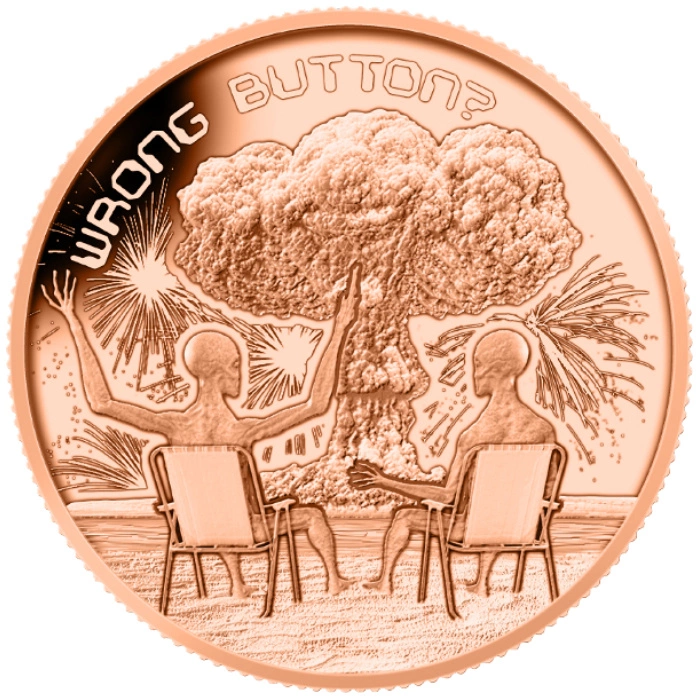 Obverse: Depicts two aliens sitting on chairs, watching a powerful atomic mushroom cloud in the distance. Above the scene appears the telling inscription “WRONG BUTTON,” creating a humorous commentary on the catastrophic result of their experiment.
