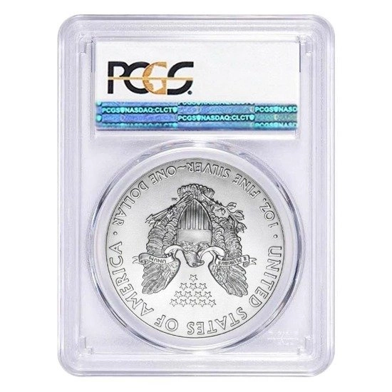 The American Eagle is a coin struck in fine silver and produced by the United States Mint. This mint prides itself on ensuring that coins are struck using locally sourced bullion. The American Eagle was first minted in 1986.This silver coin has achieved the excellent collector grade of MS70 and the coveted First Strike designation. The uniqueness of the First Strike symbol ensures that the coin was shipped from the mint within the first 30 days of the first minting. The silver coin was proofed and protected by the prestigious Professional Coin Grading Service (PCGS). The obverse was created by Augustus Saint-Gaudens for the coins minted between 1907 and 1933. It depicts the personification of Liberty, symbol of the United States and liberation, walking with the attributes of peace: an olive branch and a torch. The seat of the US Congress can be seen at her feet, with the rays of the sun in the background. The reverse is decorated by an eagle (designed by John Mercanti) holding a ribbon with the maxim "E pluribus unum" (Latin: Out of many one), referring to the unification of the states. Above the eagle are thirteen five-pointed stars, symbolising the thirteen colonies.