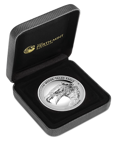 The 2022 Australian Eagle silver coin is the 7th coin of the Wedge-Tailed Eagle Series. The silver eagle has been made from pure Ag.9999 bullion, weighing 5 troy ounces, in proof and ultra high relief standards. The renowned Australian mint, The Perth Mint, is responsible for its production. It is worth mentioning that all coins from the Wedge-Tailed Eagle collection are guaranteed by the Australian government and are legal tender.The obverse of the coin features the likeness of Queen Elizabeth II of Great Britain and the coin's denomination.Rewers depict an image of an eagle with an open beak and the inscription "AUSTRALIAN WEDGE TAILED EAGLE". In addition, the bottom of the reverse shows the weight of the coin, the bullion proof and the date of issue, as well as the mint mark - "P".Do you need help? Do you have any questions?Ask a question and we'll respond promptly, publishing the most interesting questions and answers for others.