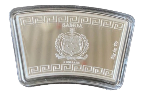 Obverse the silver ingot coin depicts the coat of arms of the islands of Samoa. In addition, the obverse contains information about the weight, bullion sample and face value of the currency.