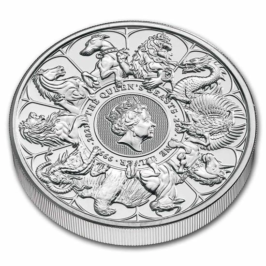 Reverse presents the 10 Beasts of the Queen, which include: The Lion of England, The Griffin of Edward III, The Red Dragon of Wales, The Unicorn of Scotland, The Black Bull of Clarence, The Falcon of the Plantagenets, The Yale of Beaufort, The White Lion of Mortimer, The White Horse of Hanover, The White Greyhound of Richmond. In addition, the reverse side shows the date of issue, weight and purity of the bullion.