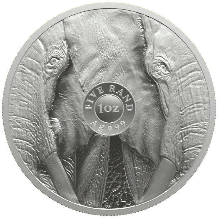 Reverse depicts two halves of an elephant's head. The reverse also includes the inscription "FIVE RAND" and information about the weight and purity of the metal. Arranging several coins in the same position allows for the depiction of an entire herd of elephants.