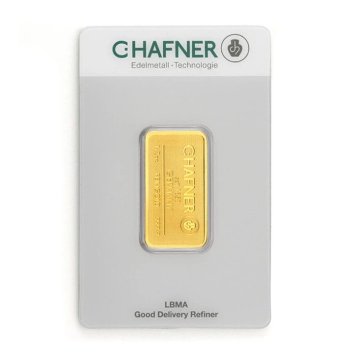 1/2 Ounce Gold Bar C. Hafner represents an outstanding union of German precision and a family tradition dating back to the mid-19th century. Each bar is cast and finished at C. Hafner GmbH + Co. KG facilities in Pforzheim, recognized as Europe’s jewelry capital. The weight of 1/2 ounce (approx. 15.55 g) enables both novice and seasoned investors to easily scale portfolios while maintaining excellent liquidity. The sleek rectangular shape fits perfectly into safes and deposit boxes, and each bar's unique serial number guarantees full traceability of the metal’s origin.