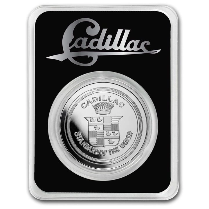 The coin was struck in Ag.999 silver, weighing 1 troy ounce and measuring 39mm in diameter. There is no indication of the coin's face value on the product. The product is housed in the original slab. The Overt in the central part of the coin depicts the 1902 Cadillac logo together with the words "STANDARD OF THE WORLD", "CADILLAC". The obverse also features the weight and purity of the bullion. The Rewers shows the 1925 CADILLAC brand logo.