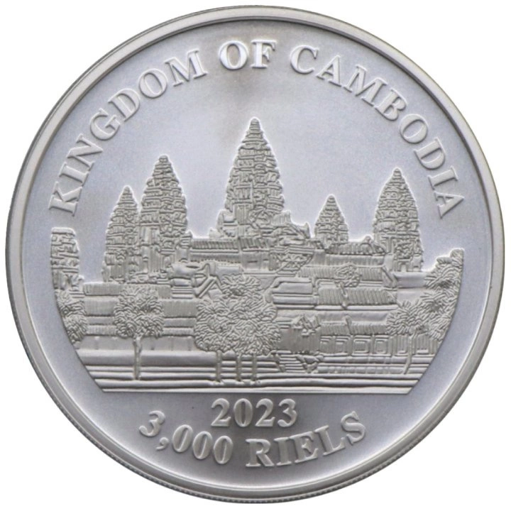 The coin was produced in pure Ag.999 bullion, weighing one troy ounce and measuring 40.7 mm in diameter. The mintage of the coin is 3,000 pieces. The 2023 Asian Silver Elephant is a product that is guaranteed by the state of Cambodia and is full legal tender in the issuing country. The Averse depicts the temple of Angkor Wat in Cambodia. The obverse shows the minting date of the coin and the face value of the coin.