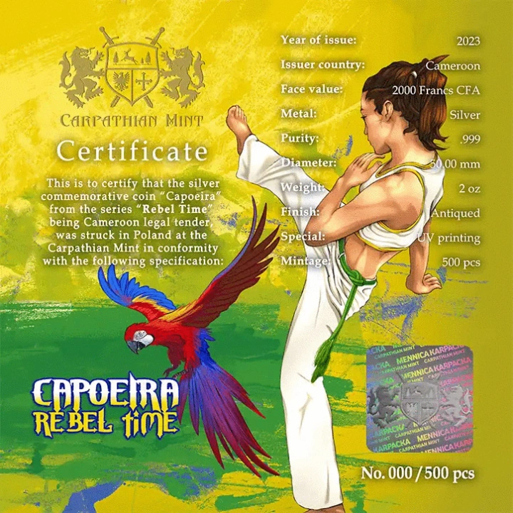 The Silver Coin Cameroon: Rebel Time: Capoeira Colored 2 oz Silver 2023 Antiqued Coin is the first coin in the "Rebel Time" series, initiated by Maciej Rybicki from the Start-Sport Foundation, based in Poland. Through its activities, this foundation builds positive relationships with people and organizations worldwide.