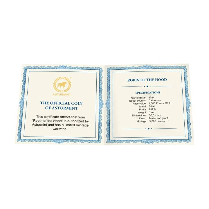 The Cameroon: Robin of the Hood 1 oz Silver Coin 2024 is a unique offering that blends investment passion with collectible elements. Drawing from one of the most iconic legends, the coin features a hero whose story has fascinated for centuries – Robin Hood, the symbol of justice in the heart of the mythical Sherwood Forest.