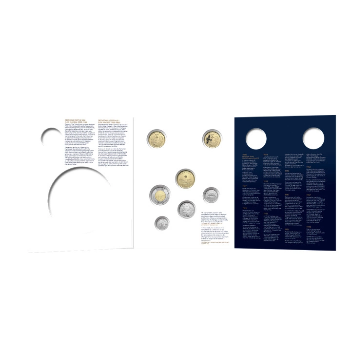 The reverses feature information on face value and the issuing country. Two 1-dollar coins show the image of Elsie MacGill with a plane. The other coins depict, in turn, a polar bear, the Common Loon duck, the Caribou reindeer, the Bluenose sailing ship, and a beaver.