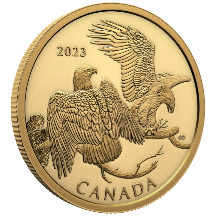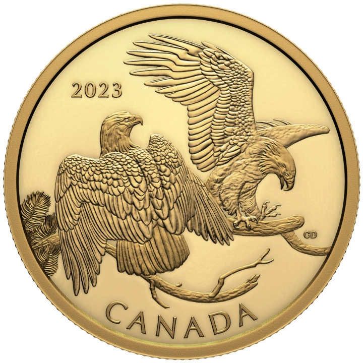 Canada: The Striking Bald Eagle $200 Gold 2023 Proof is a coin showcasing the Bald Eagle, which is a symbol of strength. Whether gliding alone, taking off from the top of the tallest tree. These predators build the largest nests up to about 1 meter wide.