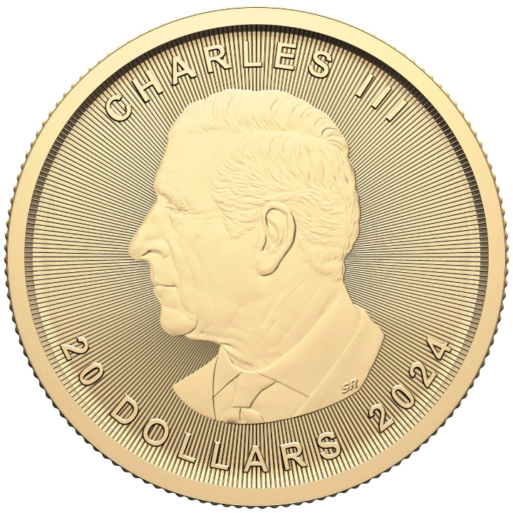 The obverse of thegold bullion coin shows the likeness of King Charles III, the denomination and the date of issue. Since 2014, additional security features include radial lines in the background of the coin.