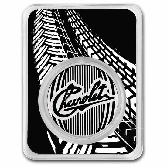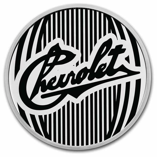 Obverse the coin depicts the car's steering wheel and the Chevrolet logo at the top of the cylinder. The obverse also includes information about the weight and purity of the bullion.