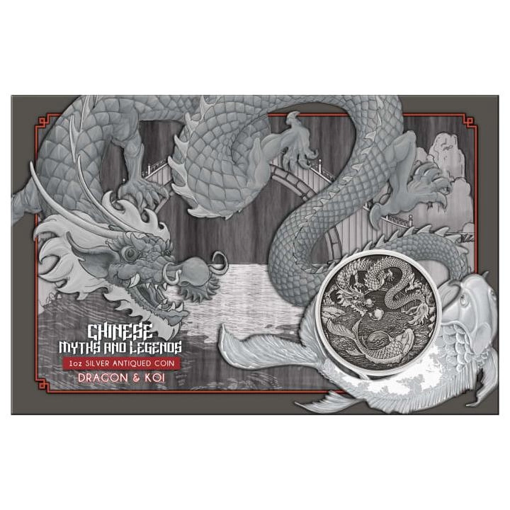 Chinese Myths and Legends: Dragon & Koi 1 oz Silver 2023 Antiqued Coin (Coin in card version)