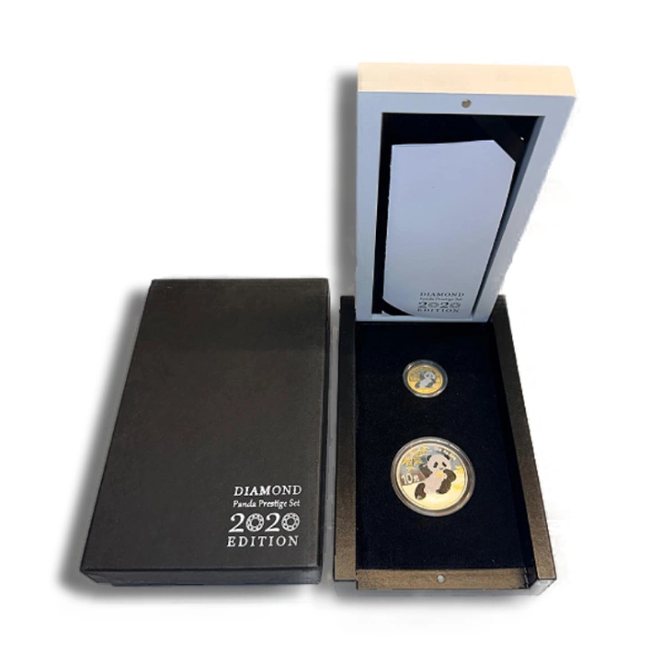 Chinese Panda Set of 2 Coins - 8 grams Gold and 30 grams Silver 2020 Diamond Prestige is a set containing an 8 gram gold coin having the Au bullion purity.999 and a 30 gram Ag silver coin. 999. Values are covered with diamond dust. Renowned precious metal producer China Gold Coin Corp is responsible for the production. It is worth mentioning that the Chinese Panda is legal tender issued exclusively by the People's Bank of China and has a government guarantee on the weight and purity of the bullion.