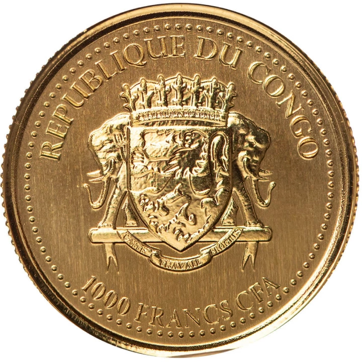 The gold coin containing the image of the Gorilla was made of pure Au.9999 gold, weighing 1/10 troy ounce. The product is also a full-fledged legal tender, guaranteed by the Government of the Republic of Congo. The product comes with individual original packaging. The Overt of the gold coin depicts the coat of arms of the Republic of Congo and information about the coin's face value. The Rewers shows the figure of an adult gorilla with a cub. The reverse also features information on the year the coin was minted, the weight and purity of the bullion.