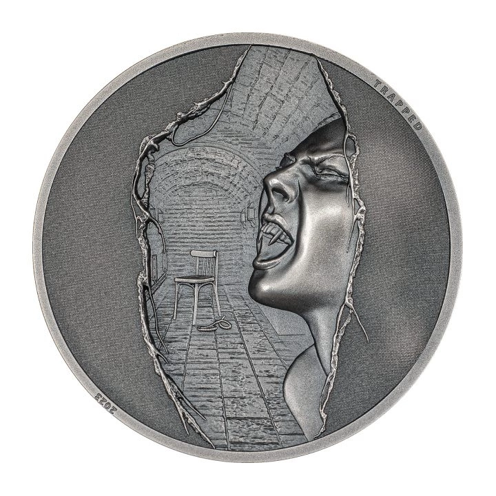 The Cook Islands Silver Collector's Coin: Trapped - Escape 1 oz Silver 2023 High Relief Antiqued Coin is an extremely interesting piece that has been made with great attention to detail. This is the fourth coin in the "Trapped" series, which follows the story of a prisoner trying to escape from the dungeons of a terrifying creature - a vampire. The coin was struck in pure Ag.999 silver, weighing 1 troy ounce and measuring 38.61mm in diameter in antiqued and high relief. The mintage of the coin is 999 pieces. The product is full legal tender in the Cook Islands. The product is legal tender in the Cook Islands. The CIT Mint - Coin Invest AG is responsible for issuing the piece.