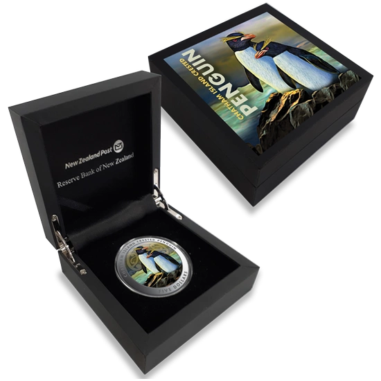 Srebrna moneta Pingwin Czubaty 2 uncje Srebra 2020 Proof to kolekcjonerski egzemplarz, który został wyprodukowany z czystego kruszcu próby 999, o wadze dwóch uncji trojańskich. Za emisję nowozelandzkiego unikatu odpowiada New Zeland Post. Moneta posiada gwarancję rządu Nowej Zelandii oraz jest pełnoprawnym środkiem płatniczym na terenie kraju emitenta. Co ważne srebrny pingwin posiada ograniczony nakład, który liczy zaledwie 750 wybitych sztuk oraz co więcej, do każdego egzemplarza jest dołączony indywidualny certyfikat autentyczności. Całość jest dostarczana w eleganckim etui.Rewers przedstawia parę pingwinów czubatych, stojących na skale na tle niespokojnego oceanu. W tle wizerunku można również zauważyć nowozelandzki wzór „koru” nawiązujący do kształtu zwiniętego liścia paproci. Całość otacza napis „Chatman Island Crested Penguin". Awers zawiera wizerunek królowej Wielkiej Brytanii Elżbiety II, projektu Ian'a Rank- Broadley'a. Dodatkowo na awersie umieszczono informację o kraju emitenta, wadze, zawartości czystego srebra oraz dacie emisji.