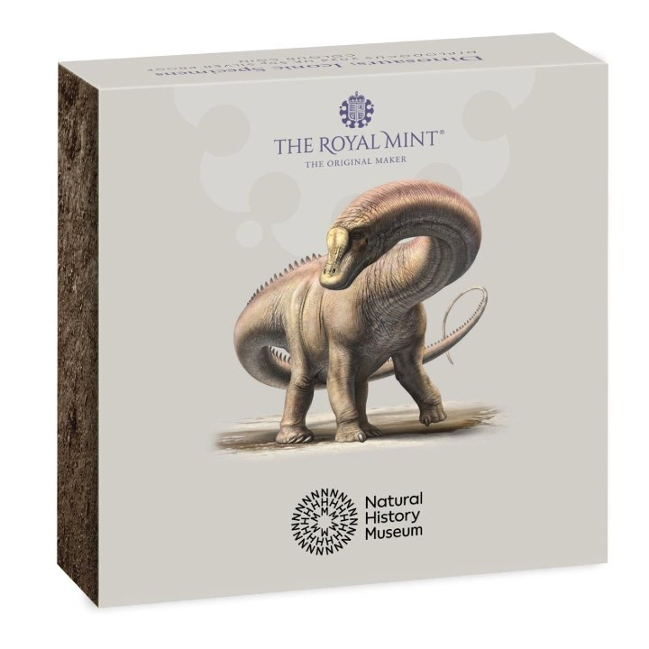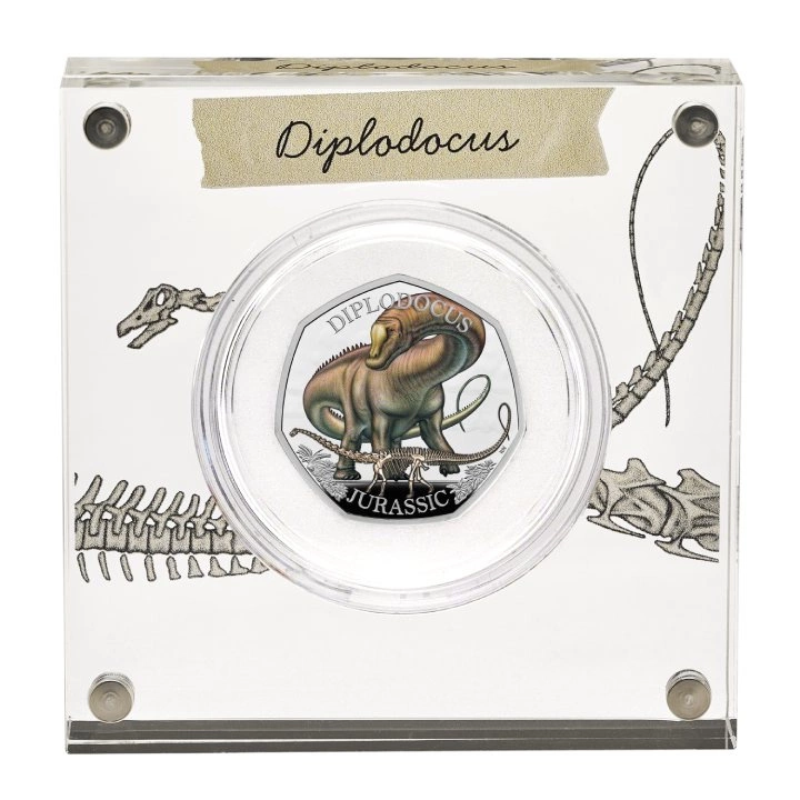 Dinosaurs: Iconic Specimens - Diplodocus coloured 50p Silver 2024 Proof is the third coin in the "Dinosaurs: Iconic Specimens" series. Diplodocus is a dinosaur of the sauropod group that lived in the Late Jurassic, about 154-152 million years ago, in what is now North America. It was one of the longest dinosaurs, reaching lengths of between 21 and 27 metres and weighing between 10 and 16 tonnes. It was characterised by a long, flexible neck and a long tail. Diplodocus was a herbivore that fed mainly on low plants, using its long neck to reach for leaves and needles. Its remains have been discovered in the United States, including Colorado, Utah and Wyoming. The specimen is minted in Ag.925 sterling silver, weighing 8 grams, 27.30 mm in diameter, in proof standard. The mintage of the coin is 5,210 pieces. In addition, this unusual piece was produced by The Royal Mint. The product has been housed in its original packaging. The coin is guaranteed by the UK government as to its legality, purity of bullion and origin of the metal, and is full legal tender in the issuer's country. The Averse shows the likeness of King Charles III of Great Britain and the denomination and year, as designed by Martin Jennings.