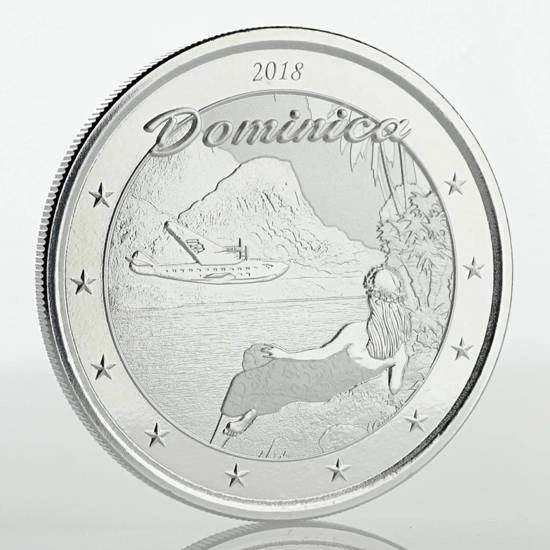The Dominica: The Nature Isle 1 Ounce Silver 2018 coin is a unique product that features an island and a woman looking at an avionet, just above the surface of the ocean. The product is from the Eastern Caribbean 8 series and the coin was struck in pure Ag.999 bullion, weighing one troy ounce and measuring 39mm in diameter. The silver coin was produced by the Scottsdale Mint, in a low mintage of only 25,000 pieces. The product is guaranteed by the Central Bank of the Eastern Caribbean.The Overt of the silver coin features the likeness of Queen Elizabeth II and the inscriptions "QUEEN ELIZABETH II" and "EASTERN CARIBBEAN CENTRAL PARK". The obverse also shows the weight, purity of the bullion and face value of the coin. The designer of the obverse was Ian Rank-Broadley. The Rewers depicts a woman lying on a rock and watching an avionic aircraft fly by. The reverse also features the inscription 'DOMINICA 2018'.Do you need help? Do you have any questions?Ask a question and we'll respond promptly, publishing the most interesting questions and answers for others.