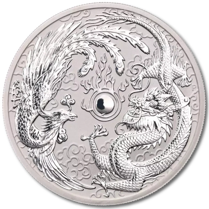 The collector's Dragon and Phoenix coin was made of silver weighing one ounce and silver grade Ag. 9999. and produced by the Australian mint Perth Mint. The Averse of the coin depicts an image of Queen Elizabeth II. The Rewers represents the extremely interesting, Dragon and Phoenix. This is a coin with a doubly royal pedigree that will make an interesting addition to any collection.