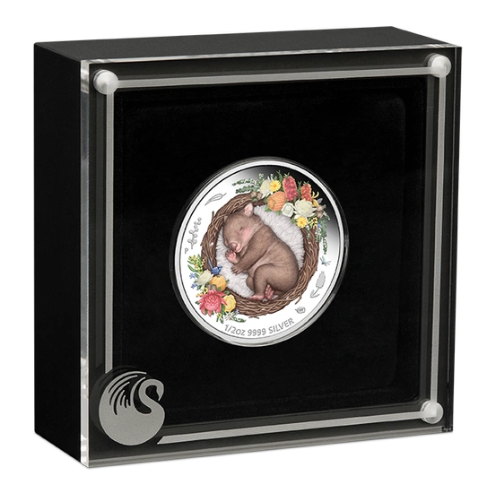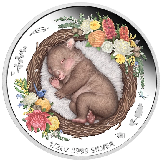 Dreaming Down Under: Śpiący Wombat kolorowany 1/2 uncji Srebra 2021 Proof to kolekcjonerska moneta, która stanowi piątą i ostatnią odsłonę unikatowej serii Dreaming Down Under. Dreaming Down Under to seria, która składa się z 5 srebrnych, 1/2 uncjowych monet. Warto dodać, iż każda moneta tworząca kolekcjonerską serię, zawiera kolorowany projekt orazwybita jest w standardzie proof.Śpiący Wombat 2021 został wyprodukowany z czystego srebra próby Ag.9999, o wadze 1/2 uncji trojańskiej oraz średnicy liczącej 32,6 mm. Za jej produkcję odpowiada szanowana, australijska mennica The Perth Mint. Ponadto, wspomniany Wombat posiada limitowany nakład liczący 5 000 sztuk oraz jest dostarczany w prezentacyjnym opakowaniu wraz z certyfikatem autentyczności. Awers srebrnej monety Dreaming Down Under: Śpiący Wombat kolorowany, zdobi podobizna Królowej Elżbiety II projektu Jody’iego Clark’a. Całość otacza napis „ELIZABETH II”, „AUSTRALIA” oraz informacja o roku bicia i wartości nominalnej. Rewers przedstawia urocze dziecko Wombata, śpiące w gnieździe w otoczeniu kolorowych, australijskich kwiatów. Na rewersie znajduje się również znak mennicy Perth Mint "P" wraz z informacją o wadze i czystości kruszcu. Projektantką rewersu była Elise Martinson.