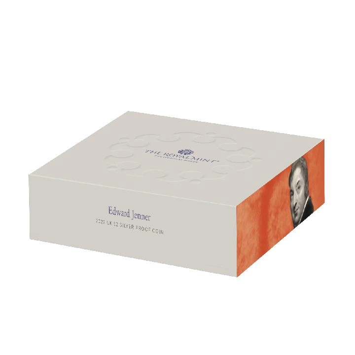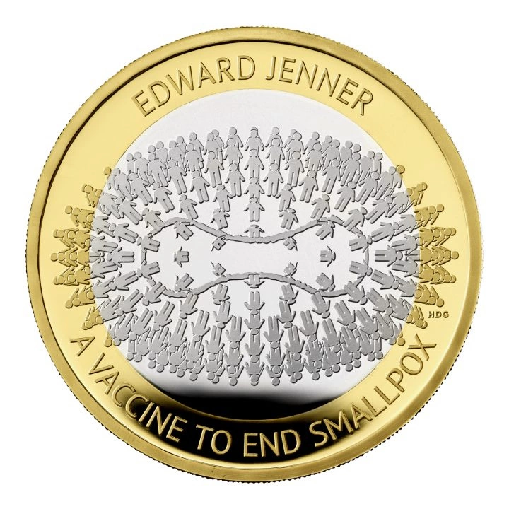 Rewers depict the core of a smallpox cell surrounded by icons representing people and the inscriptions "EDWARD JENNER", "A VACCINE TO END SMALLPOX". Henry Gray is responsible for the reverse design.