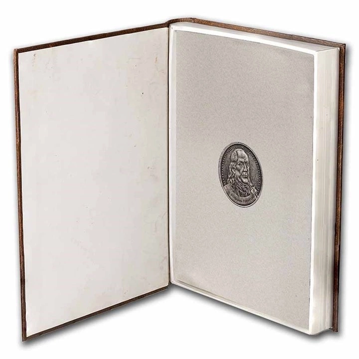 The obverse shows a printing press, religious symbols and the inscriptions "FREEDOM OF SPEECH, PRESS, RELIGION". On the obverse side, there is also information about the weight and purity of the bullion.Rewers presents a portrait of Benjamin Franklin.