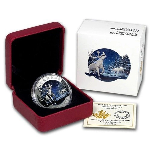 This ingenious coin design combines a mass of polygons to form the image of Rangifer tarandus - a species of mammal in the deer family (Cervidae), inhabiting the Arctic tundra and forest-tundra in Eurasia and North America.This is the third coin in the "Geometry in Art" series. , a series that reinterprets Canada's national signs. The unique engraving, relief and use of various finishing techniques adds distinctiveness to the shapes of each polygon, which create a stylised image and showcase the craftsmanship and beauty of the workmanship. The technique and art known as "low poly" (polygonal art - the representation of familiar shapes using the simplest possible polygons that meet at the edges) , previously known from video games, was combined with the outstanding drawing and sculpting skills of the project's originators, resulting in a coin that we have never seen before. The rich, vivid colours, associated by many with the aurora borealis, give a sense of depth and a visible battle of light, as well as a sense of three-dimensionality. The obverse as with every Canadian coin is decorated with an effigy of Queen Elizabeth II, the coin is minted with a mirror stamp and therefore lacks the radial lines in the coin's background.