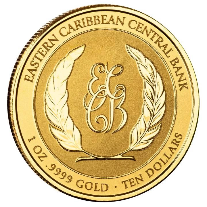 Obverse: The coin features a stylized monogram "ECB" (Eastern Caribbean Bank) encircled by a laurel wreath. Surrounding the central design are inscriptions: "EASTERN CARIBBEAN CENTRAL BANK," along with details of weight, gold purity, and face value. The coin carries a guarantee and legal tender status in the eight countries under the Eastern Caribbean Central Bank.