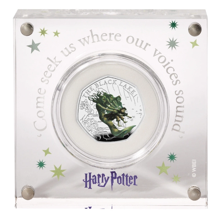 Harry Potter: Black Lake Colored 50p Silver 2024 Proof commemorates one of the most memorable events from Harry Potter's fourth year at Hogwarts School of Witchcraft and Wizardry – the second task of the Triwizard Tournament. In this special edition, the young wizard is depicted at a key moment as he bravely dives into the dark depths of the Black Lake to recover a precious treasure stolen by the merpeople.