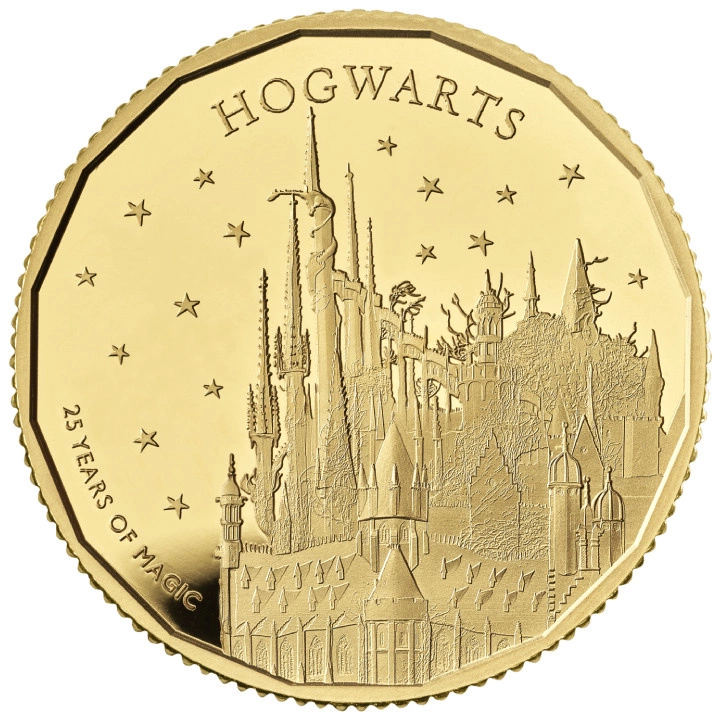 Rewers of the coin depict the Hogwarts School of Magic and Wizardry and the inscriptions "HOGWARTS" and "25 YEARS OF MAGIC". Ffion Gwillim is responsible for the design of the reverse.